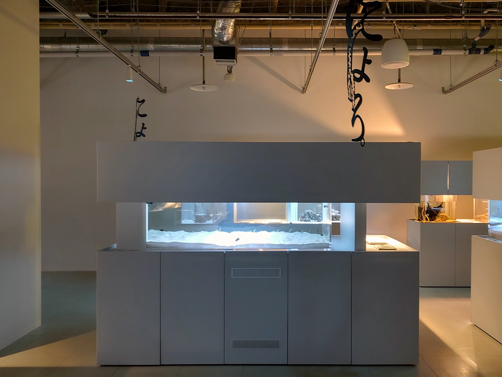 ちんあなご水槽のある“LIBRARY AQUARIUM”では、一つの水槽に一種の生物だけを展示し、隣には関連する書籍を並べるという独自のスタイルを採っており、まるでショールームのような雰囲気が漂う。