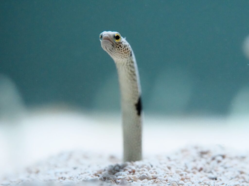 ちんあなご水槽も例外ではなく、展示生物はチンアナゴ(とマガキガイ)のみという潔さ。2025年のリニューアルではニシキアナゴの水槽も新設された。